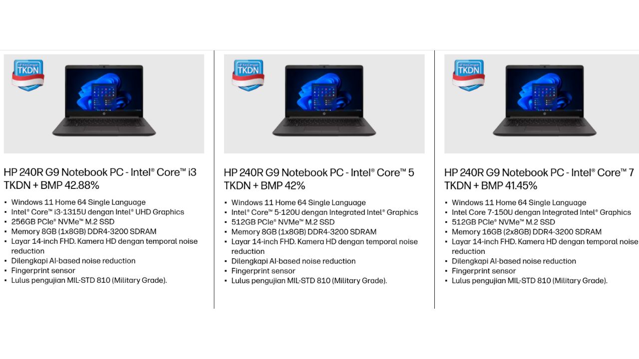 Tipe laptop HP yang sudah termasuk kategori produk TKDN adalah seri HP 240R G9 Notebook PC. Ada tiga tipe yang sudah memenuhi standar TKDN 40%, yakni HP 240R G9 Notebook PC dengan Intel® Core™ i3, Intel® Core™ 5, dan Intel® Core™ 7. Notebook HP 240R G9 menghadirkan fitur-fitur penting yang siap untuk kebutuhan bisnis dalam desain tipis dan ringan sehingga mudah dibawa ke mana pun Anda pergi. Prosesor Intel® yang bertenaga, memori dan penyimpanan yang cepat, serta rasio layar terhadap bodi yang besar pada layar 14 inci menjadi kunci produktivitas, sementara port yang tersedia memungkinkan Anda menghubungkan berbagai peripheral, semua itu dengan harga yang tetap bernilai.