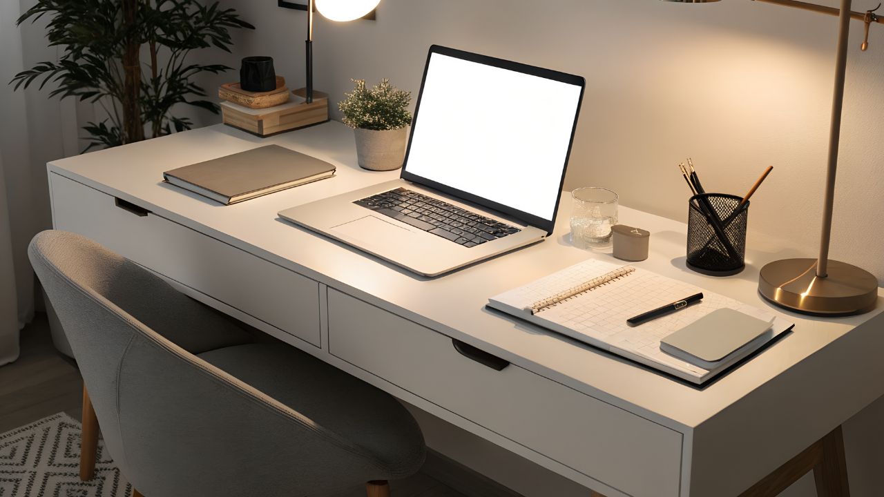Banyak meja kantor yang sudah terlengkapi dengan laci, rak, atau kabinet kecil yang memudahkan pengguna menyimpan dokumen maupun alat tulis. Kehadiran fitur penyimpanan ini membuat meja tetap rapi dan membantu pengguna lebih mudah menemukan barang yang dibutuhkan. Namun, jika pekerjaan lebih mengandalkan sistem digital dan jarang menggunakan dokumen fisik, meja minimalis tanpa laci mungkin lebih cocok karena desainnya lebih sederhana dan tidak memakan tempat.