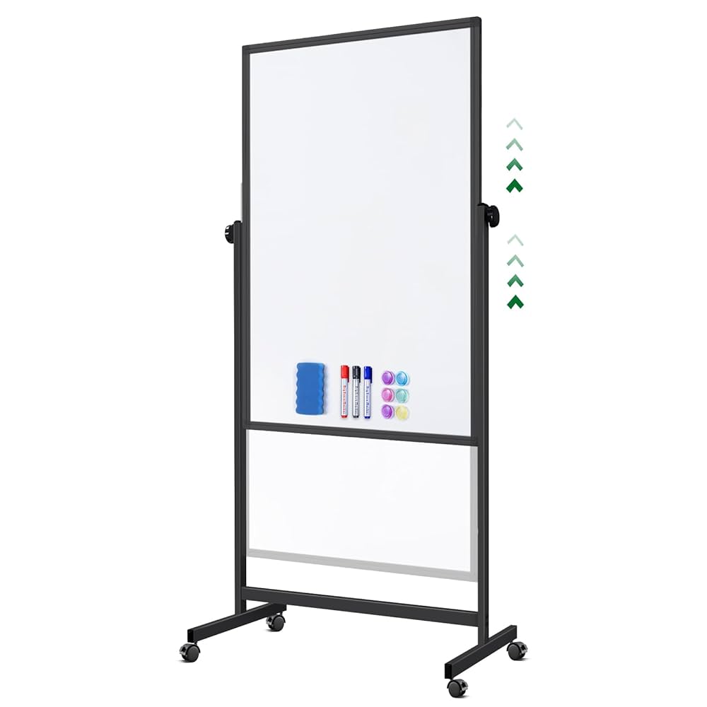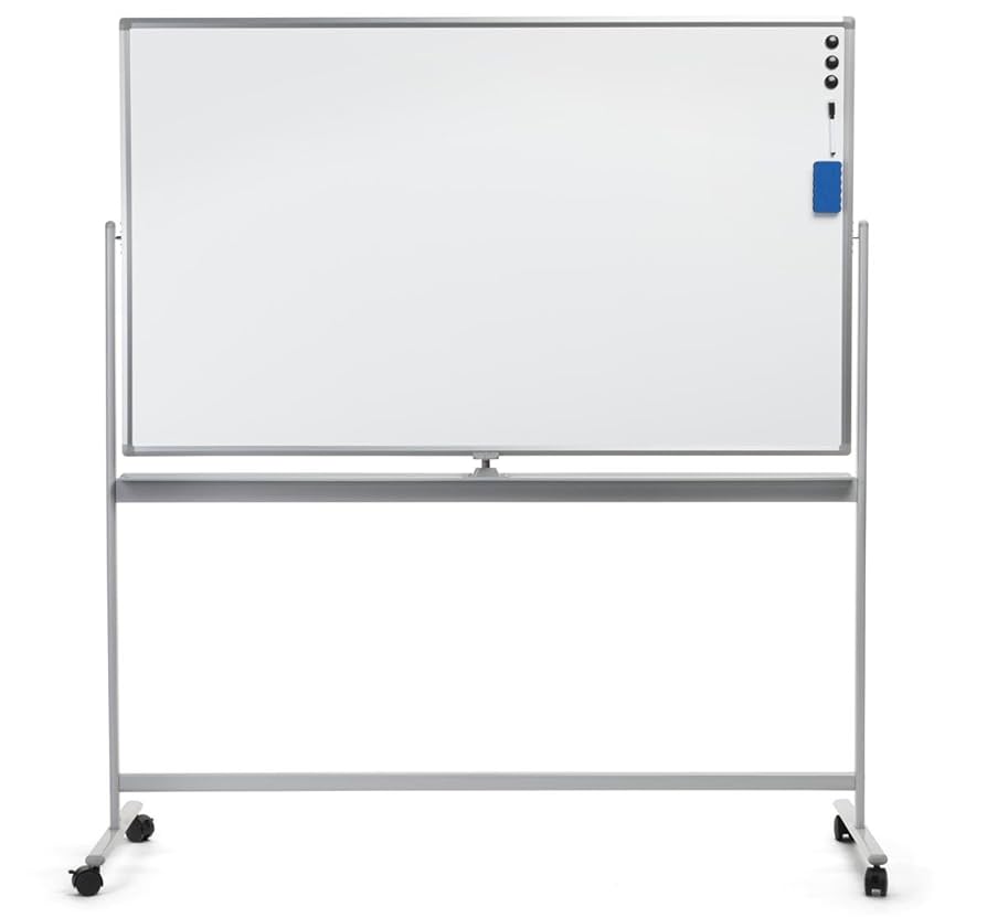 Beberapa papan tulis standing juga memiliki dua sisi (bolak-balik), sehingga kedua permukaannya dapat berguna secara bergantian atau bersamaan. Anda hanya perlu memutar papan untuk menjangkau permukaan yang satunya. Ini sangat praktis untuk sesi pelajaran atau presentasi panjang agar tidak perlu sering menghapus papan.
