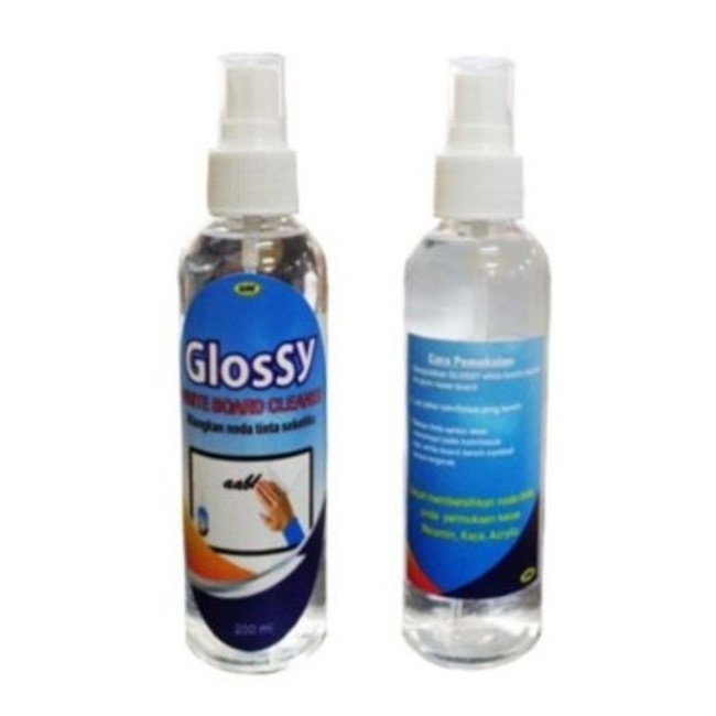 Glossy Whiteboard Cleaner menjadi salah satu pilihan cairan pembersih papan tulis yang tersedia di Indonesia. Cairan pembersih papan tulis dari Glossy memang berfungsi khusus untuk membersihkan noda tinta marker yang membandel tanpa merusak permukaan papan. Cairan ini biasanya dikemas dalam botol semprot sehingga sangat praktis. Keunggulan produk ini adalah aromanya yang tidak terlalu menyengat dan harum. Dapat membersihkan noda marker pada permukaan kertas, white board, melamin, acrylik, dan kaca. Bahannya yang aman, tidak menimbulkan iritasi pada kulit. Anda bisa membeli Glossy Whiteboard Cleaner di berbagai toko alat tulis konvensional, atau juga bisa membelinya secara online dengan harga yang sangat terjangkau.