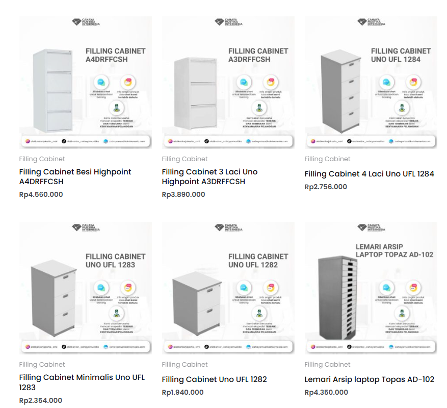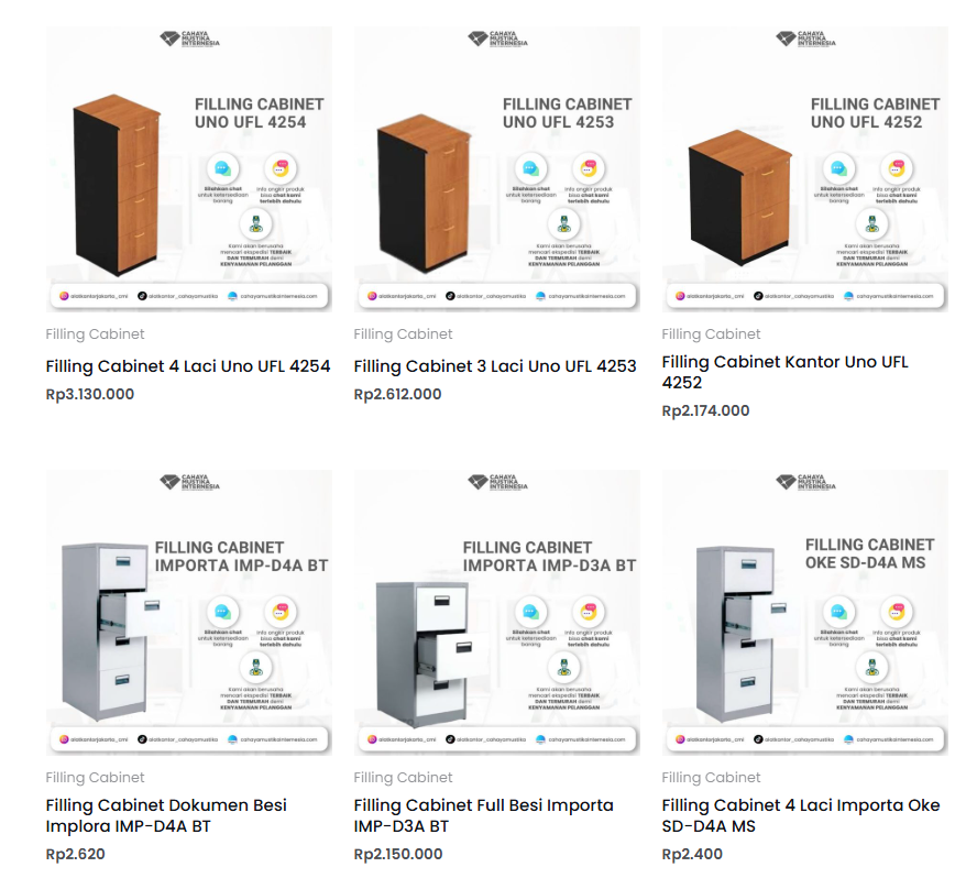 Dengan kantor pusat yang berlokasi di Jakarta, PT Cahaya Mustika Internesia menghadirkan berbagai pilihan filling cabinet, baik dari bahan metal (besi) maupun kayu, dengan desain yang menyesuaikan kebutuhan ruang kerja modern. Produk-produk mereka tersedia dalam berbagai ukuran dan konfigurasi laci, mulai dari 2 laci, 3 laci, hingga 4 laci, yang dapat anda gunakan untuk penyimpanan dokumen folio maupun A4.